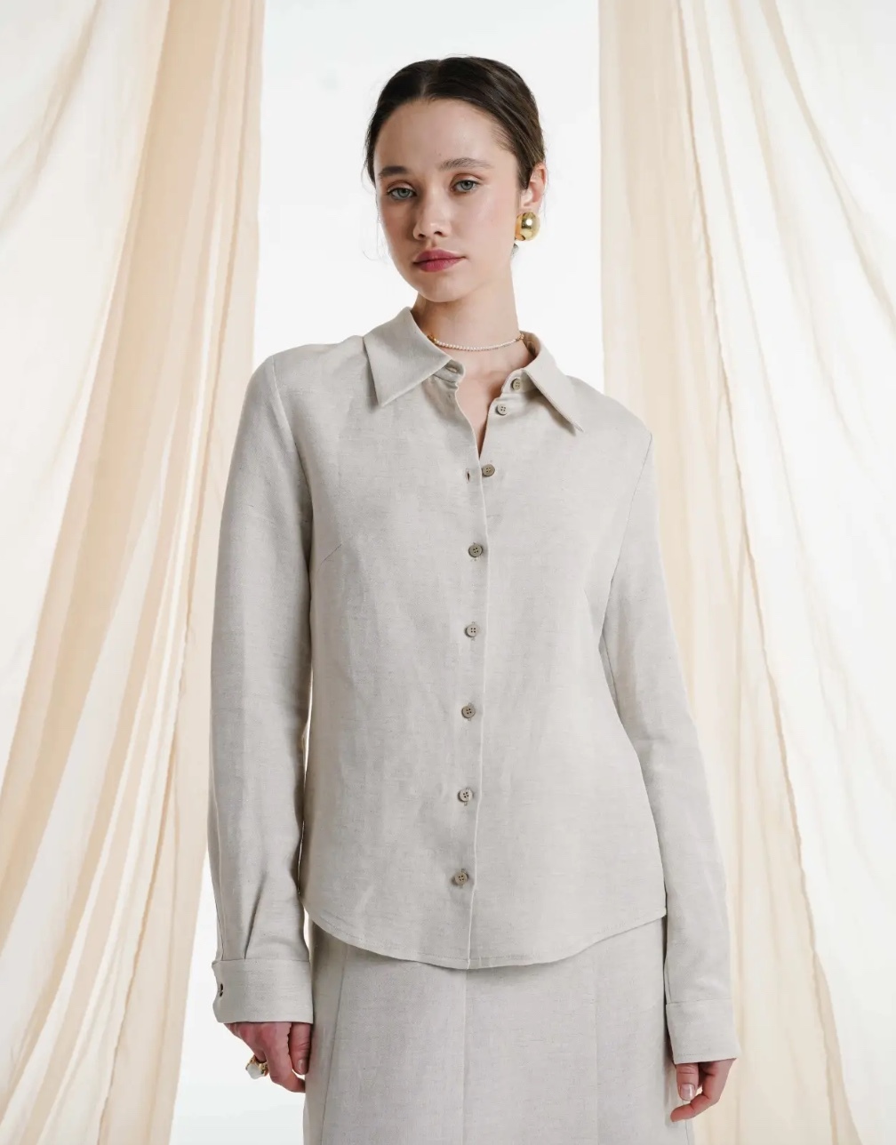 Рубашка приталенная, умеренного объёма, длиной до середины бедра.